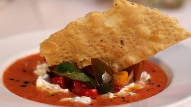 LA RICETTA: ZUPPETTA FRESCA DI POMODORI GIALLI E ROSSI AL BASILICO E PEPE CON STRACCIATELLA DI BUFALA, ERBA CIPOLLINA E KAMUT (gentilmente offerta da Il Margutta Ristorarte - Roma)- Pulire e frullare nel mixer 400 grammi di pomodori a grappolo, mezza cipolla di Tropea, due cetrioli, sale, pepe e 40 gr di olio extravergine d'oliva. Mettere la crema in frigo. Tagliare a spicchi i pomodorini colorati (80 grammi di gialli, altrettanti di verdi, rossi, neri, in varie misure) metterli a marinare con una parte delle erbe, sale e pepe e olio extravergine d'oliva. Preparare una sfoglia di kamut, stenderla in sfoglia sottile, tagliarla a strisce larghe e disporle su una teglia, spennellare con olio extra vergine d'oliva e metterle in forno a 180° per 10 minuti. In un piatto deporre un letto di crema di pomodori,la burrata i pomodorini tagliati, coprire con la sfoglia e decorare con le erbette. LA RICETTA PASSO PER PASSO