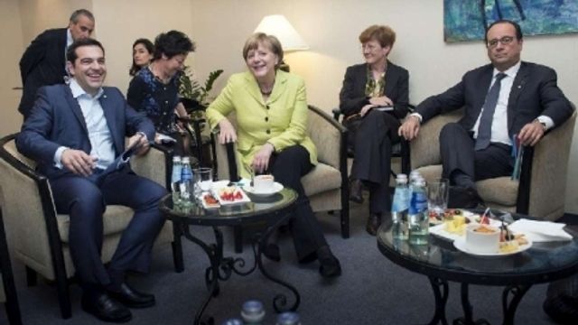 Merkel, Hollande e Tsipras, dopo la cena del vertice per il partenariato orientale, si sono riuniti in una sala al primo piano dell'albergo nei pressi della sede del vertice in cui sono ospitati tutti i leader europei, per un confronto politico diretto. Quando ne escono, Merkel e Hollande non sorridono, il greco, qualche passo più indietro, ha un sorriso di circostanza. Nessuno dei tre rilascia dichiarazioni.