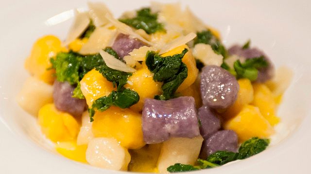 LA RICETTA: GNOCCHI SU FONDUTA DI PECORINO BIOLOGICO CON CIMETTE DI RAPA SALTATE – (La ricetta è gentilmente offerta da Il Margutta Ristorarte - Roma) Iniziare preparando i tre tipi di gnocchi, con zucca, patate e patate viiolette. Preparare i tre tipi di gnocchi seguendo le istruzioni della RICETTA SPIEGATA PASSO PER PASSO. Far saltare in padella 50 grammi di cime di rapa con uno spicchio d'aglio intero e un peperoncino. Preparare la fonduta grattugiando 20 grammi di pecorino bio 24 mesi e 90 grammi di pecorino 6 mesi bio in 200 ml latte a 90 gradi, e tenendo il composto a bagno maria a temperatura stabile fino a scioglimento completo del formaggio. Cuocere gli gnocchi e saltarli con 25 grammi di burro. Condire con la fonduta e servire.