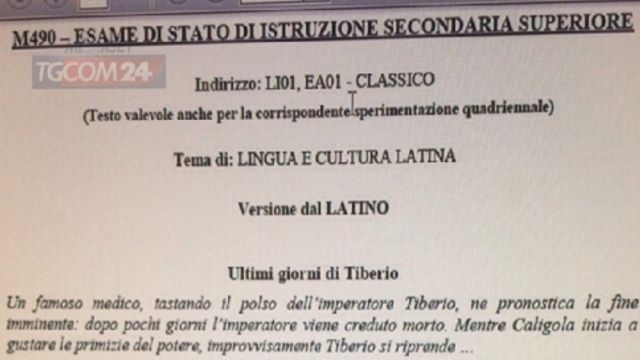 Quest'anno, per la prima volta, la versione è accompagnata da una breve introduzione che spiega il contesto. "Un famoso medico - si legge -, tastando il polso dell'imperatore Tiberio, ne pronostica la fine imminente: dopo pochi giorni l'imperatore viene creduto morto. Mentre Caligola inizia a gustare le primizie del potere, improvvisamente Tiberio si riprende...". Tacito non "usciva" alla Maturità dal 2005.