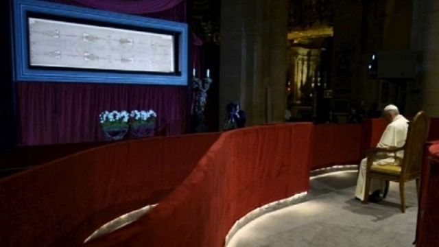 In Duomo per contemplare la Sindone - Momento di raccoglimento davanti alla Sindone, nel Duomo di Torino, per Papa Francesco. Dopo l'applauso dei fedeli di fronte alla cattedrale di San Giovanni, e la benedizione, il Pontefice è entrato nella Chiesa e si è seduto di fronte al telo, la testa reclinata verso il basso e le luci abbassate.