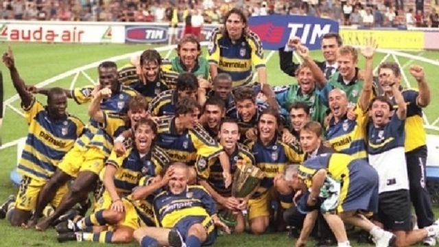 Malesani e poi il declino Ancelotti se ne andò nel 1998, dopo un'altra buona stagione conclusa col sesto posto. In vista della stagione 1998-1999 venne assunto Alberto Malesani e furono acquistati dalla Sampdoria Juan Sebastián Verón e Boghossian, che aveva appena vinto i Mondiali con la Francia. Fu la stagione più vincente della storia del Parma, che vinse la Coppa Italia (battendo in finale la Fiorentina) e di nuovo la Coppa UEFA battendo 3-0 il Marsiglia in finale (ad oggi è l'ultima squadra italiana ad aver vinto il trofeo). Quello che sconfisse i francesi era probabilmente il Parma più forte di sempre: giocava col 3-4-1-2, in porta c'era Buffon, i tre di difesa erano Thuram-Cannavaro-Sensini, la mediana era composta da Verón, Dino Baggio e Boghossian e i due attaccanti erano Chiesa e Crespo. Dopo qualche stagione e la conquista di un'altra Coppa Italia, nel 2004 il Parma fu coinvolto nel cosiddetto “crac Parmalat”, cioè il fallimento della società che controllava la squadra in seguito alla scoperta di svariati miliardi evasi negli anni dall'azienda. Il Parma rimase in amministrazione controllata fino al 2007, che fu anche l'ultimo anno in cui disputò una coppa europea (la squadra finì fra le prime otto in classifica per tutti i primi anni Duemila tranne nella stagione 2004-2005).