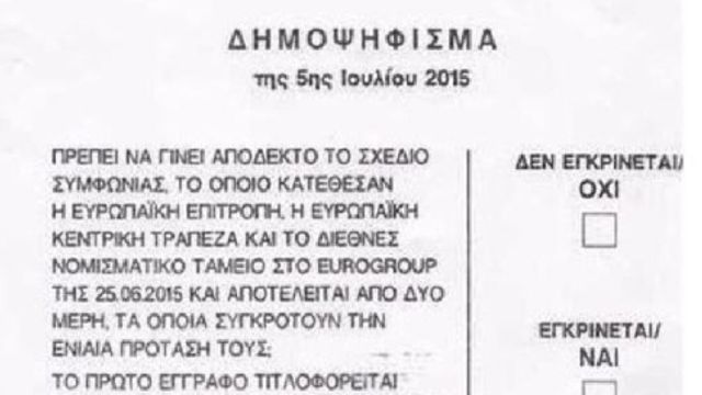 Il 5 luglio i greci sono chiamati a esprimere una decisione sulla Grexit: dire sì alla proposta della troika per rimborsare il debito di Atene accettando le riforme di austerity e di tagli sulle pensioni o uscire dall'euro con i rischi che ciò ne comporta. Il premier greco Alexis Tsipras, domenica, voterà "no". E sulla scheda compare prima "oxi", ossia no, di "nai", sì.