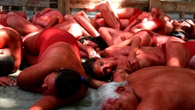 E' un rosso sangue che impressiona quello che decine di attivisti del movimento animalista Peta spagnolo hanno scelto per colorare i loro corpi nudi ed esporli nelle strade di Pamplona. Rievoca il sangue che scorre nelle corride e durante la tradizionale festa cittadina di San Firmino, caratterizzata dall'Encierro, la corsa con i tori lanciati lungo un percorso di 800 metri. Nudi e "insanguinati" gli animalisti hanno colorato la vigilia della festa con un flash mob nella città spagnola.