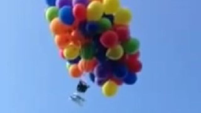 Probabilmente ispirato da Up!, cartone animato nel quale una casa vola grazie a un mucchio di palloncini legati al tetto, il 26enne canadese Daniel Boria ha tentato la stessa performance ma in formato ridotto. E dopo aver legato 150 palloncini a una sedia, si è alzato in volo sopra Calgary per pubblicizzare la sua attività. All'atterraggio, però, è stato arrestato dalla polizia.