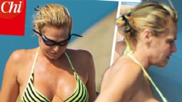 Poco manca al topless, ma la Ventura paparazzata in acque spagnole si sistema il reggiseno e sistema il seno strabordante dentro un triangolo rigato che fatica a contenere il décolleté florido della conduttrice. Occhialini, capelli raccolti e in posa da sirena SuperSimo si prepara al tuffo, poi si concede un'intensa lettura sullo yacht tra un flash e l'altro...