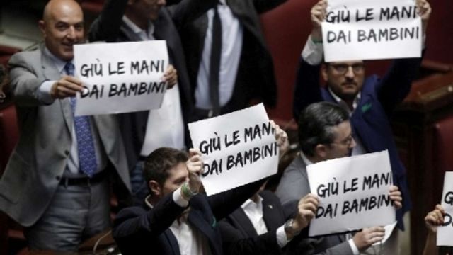 Lega, cartelli in Aula - Prima del voto la seduta è stata sospesa per le proteste dalla Lega Nord. I deputati del Carroccio hanno esposto cartelli con la scritta "giù le mani dai bambini". Il capogruppo Massimiliano Fedriga è stato espulso dall'Aula.