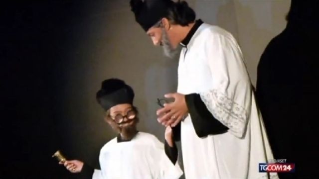 Rosario Fiorello si esibisce a sorpresa con la figlia a Taormina. Debutto inaspettato per la piccola Angelica, che a 9 anni è salita sul palco del Teatro Antico della città, dove lo showman ha portato il suo spettacolo "L'Ora del Rosario". Vestiti da preti, barba per lui, occhialoni per lei, i due hanno divertito gli spettatori con una gag che ha coinvolto anche il maestro Enrico Cremonesi, nei panni di un chierichetto.