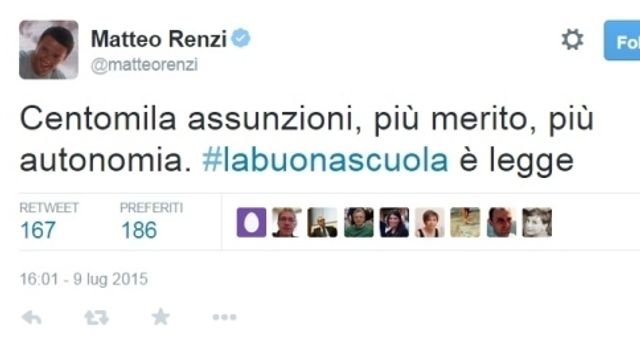 Matteo Renzi festeggia con un tweet l'approvazione definitiva della riforma della Scuola. "Centomila assunzioni, più merito, più autonomia. La buona scuola è legge", scrive il presidente del Consiglio. Poi, su Facebook, il premier detta l'agenda del governo: "Abbiamo incardinato la Pubblica amministrazione alla Camera per il rush finale, poi focus su fisco e riforme costituzionali verso il referendum del 2016".