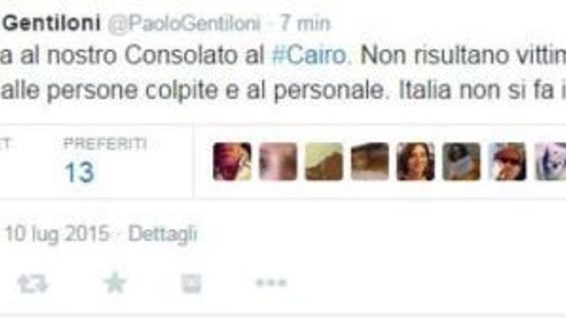 "L'Italia non si fa intimidire". Così il ministro degli Esteri Paolo Gentiloni in un tweet commentando l'esplosione dell'autobomba avvenuta davanti al Consolato italiano a Il Cairo. Il ministro ha confermato inoltre che "non risultano vittime italiane". "Vicini alle persone colpite e al personale", ha quindi aggiunto.