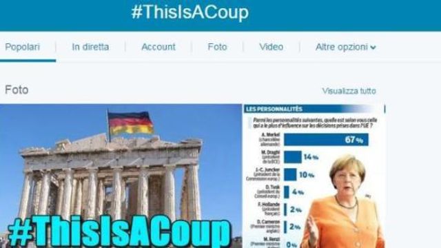 "Questo è un colpo di Stato". Ecco l'hashtag che nelle ultime ore ha scalato i top trend topic del mondo scatenando un fiume di tweet contro le richieste dell'Eurogruppo ad Atene. Il web, insomma, nelle ore cruciali per l'evolversi della crisi, si schiera con la Grecia.