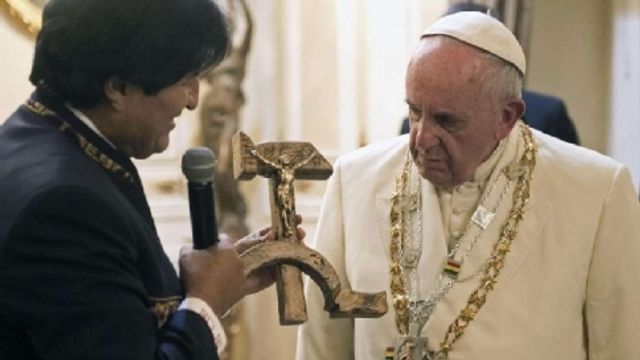 Il Papa non considera "un'offesa" il crocifisso posto su falce e martello, ispirato al disegno del gesuita Espinal assassinato dalla dittatura, regalatogli dal presidente boliviano Morales. "Capisco questa opera - ha detto Francesco -, la considero un'espressione di arte di protesta, per me non è stata un'offesa. Ve lo dico perché non ci siano opinioni sbagliate. La porto con me in Vaticano".