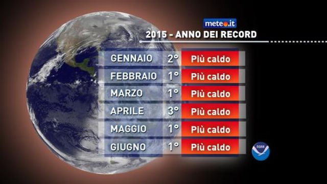 Lo scorso mese di giugno è risultato, a livello globale, il giugno più caldo di tutta la serie storica che risale al 1880, con un'anomalia termica di ben 0,88 °C oltre la media del ventesimo secolo. Lo stesso tipo di record mensile era già stato superato altre tre volte quest'anno, nei mesi di febbraio, marzo e maggio, mentre gennaio ed aprile si sono classificati rispettivamente "soltanto" 2° e 3°. Di conseguenza anche il primo semestre del 2015 ha battuto tutti i record, risultando il più caldo in assoluto; e un nuovo record è stato stabilito anche dalla temperatura media globale per il periodo di 12 mesi consecutivi (luglio 2014-giugno 2015).