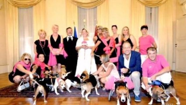 Nozze animaliste a Livorno. Stefania e Massimiliano hanno pronunciato il fatidico "sì" accompagnati da una serie di amici a quattro zampe. Si tratta di 15 beagle salvati dal canile lager di Green Hill, adottati dalla coppia e salvati dal destino tragico della sperimentazione. Vestiti a festa anche i piccoli beagle, con tanto di elegante papillon rosa.