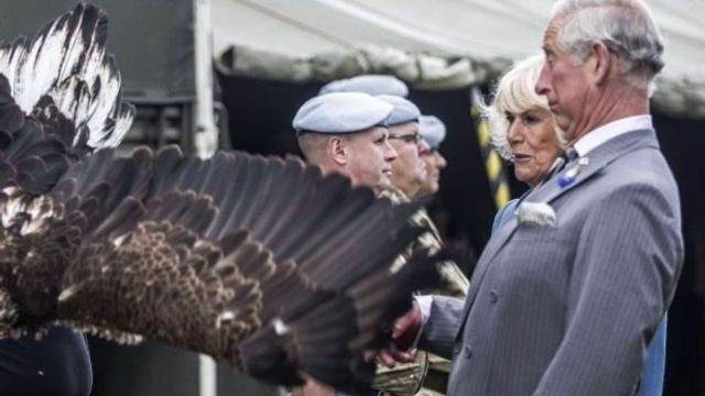 Incontro ravvicinato tra un'aquila calva, mascotte della British Army Air Corps, e il principe Carlo. L'erede al trono britannico si trovava a Sandringham, nel Norfolk, per presenziare a un festival floreale in compagnia della moglie Camilla, duchessa di Cornovaglia. Momenti di imbarazzo quando l'aquila Zephyr, questo il nome dell'uccello, ha sbattuto improvvisamente le ali a pochi passi dai reali. Le smorfie del principe hanno tradito un po' di apprensione, ma tutto si è risolto con una risata.