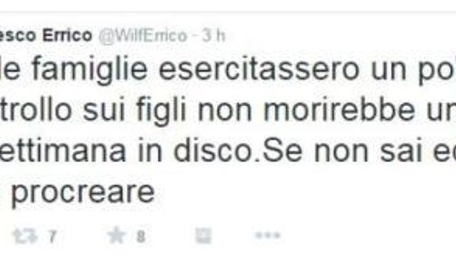 "Se le famiglie esercitassero un po' più di controllo sui figli non morirebbe un 18enne la settimana in disco. Se non sai educare non procreare". Lo ha scritto sul suo profilo Twitter Francesco Errico, sindaco di Gallipoli, uno dei centri della movida salentina, riferendosi alla tragedia di Santa Cesarea Terme, dove un 18enne, Lorenzo Toma, è morto dopo una serata in discoteca.