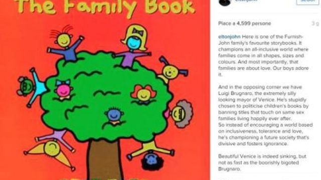 Elton John ha duramente attaccato sul suo profilo Instagram il sindaco di Venezia, Luigi Brugnaro, dandogli del "bigotto" e dello "sciocco". Sotto accusa la controversa decisione del primo cittadino di bandire dalle scuole della Laguna i cosiddetti libri sui "gender", in cui si parla di famiglie con genitori dello stesso sesso. Il cantante inglese, da sempre strenuo difensore dei diritti gay, è padre di due figli col marito David Furnish.