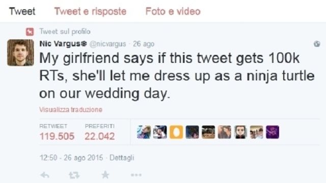 Forse non lo credeva possibile, ma nel dubbio: mai scommettere. Lo sa bene la fidanzata di Nic Vargus. Qualche giorno fa il ragazzo di San Francisco ha pubblicato un tweet singolare: "Se questo messaggio verrà ritwittato 100.000 volte, la mia fidanzata mi farà vestire come una tartaruga ninja al nostro matrimonio". Incredibilmente, ha raggiunto la quota della scommessa e l'ha anche superata. Se la sua futura moglie manterrà fede all'impegno preso, Nic potrà arrivare all'altare con un abito davvero inusuale per il giorno delle nozze.