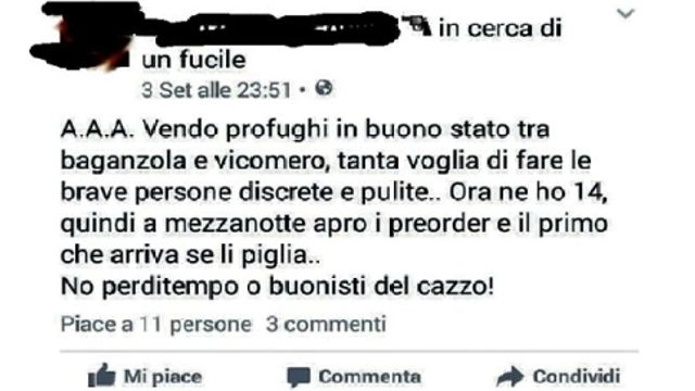 "AAA Vendo profughi in buono stato tra Baganzola e Vicomero, tanta voglia di fare le persone discrete e pulite. Ora ne ho 14 quindi a mezzanotte apro i preorder e il primo che arriva se li piglia. No perditempo o buonisti del c." è il messaggio shock postato su Facebook da un volontario di Parma della Croce Rossa locale, dopo l'arrivo a Baganzola di un gruppo di migranti. La frase ha scatenato un putiferio che dal Web è arrivato sul tavolo del sindaco di Parma Federico Pizzarotti, che ha precisato: "La città non si identifica con atteggiamenti di questo tipo e non incarna quei sentimenti". Prende le distanze da quelle parole anche il Comitato Provinciale di Parma della Croce Rossa Italiana sulla sua pagina Facebook.