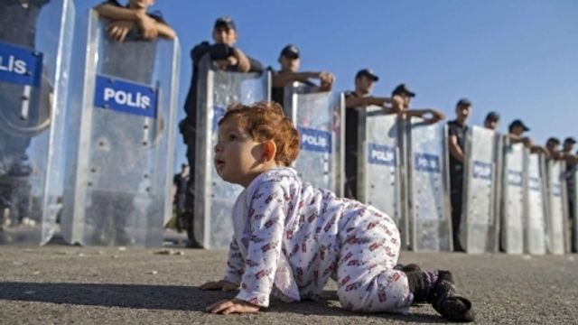 Pigiamino con pupazzetti, bavaglino, e ricci rossi spettinati: la piccola gattona e si guarda intorno con curiosità, poi si siede. Non è al nido o in un giardino, neanche nella sua cameretta, ma sull'autostrada Istanbul-Edirne, davanti a un cordone di polizia. Una baby-profuga siriana di neanche un anno che aspetta, anche lei, di passare il confine tra Turchia e Grecia. E la foto diventa uno dei simboli dell'emergenza profughi.