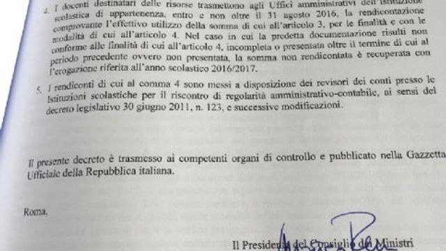 "Firmato il decreto sulla carta elettronica dei docenti. Cinquecento euro per la loro formazione". Lo afferma il premier Matteo Renzi, pubblicando su Twitter la firma ad una delle misure della Buona Scuola. Gli fa eco sempre sul social network il ministro Giannini che commenta: "Un'altra misura concreta".