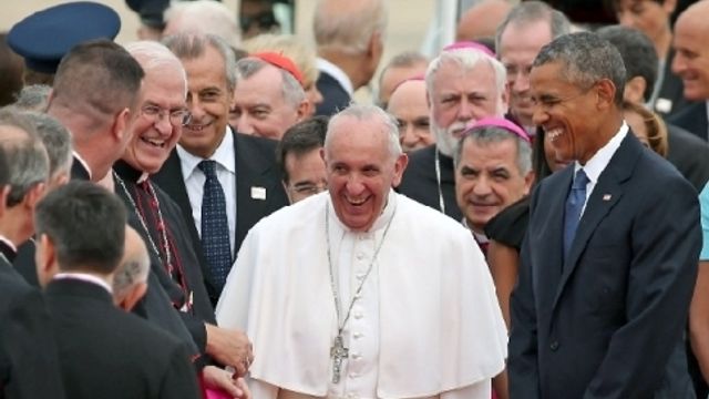L'aereo proveniente da Cuba con a bordo Papa Francesco è atterrato alla base di Andrews, alle porte di Washington. Ad accoglierlo c'era il presidente americano Barack Obama con la first lady Michelle e le figlie Malia e Sasha. L'aereo papale è stato accolto dai canti di qualche centinaio di persone, tra cui numerosi studenti, che cantavano "Hey Hey Pope Francis is on the way" e ancora "We love Pope Francis every day".