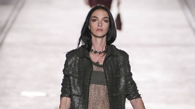 Ma la collezione racconta molto di più: i look iniziali si compongono di giacche dal taglio preciso strette in vita da severe cinture, la tuta camouflage è ampia e scende morbida sul corpo, il completo giacca/pantalone ha quel tocco maschile che lo rende portabilissimo e adatto a tutto le fisionomie (sebbene le modelle lo portino con una sola fascia a coprire il seno, ma è la passerella!).