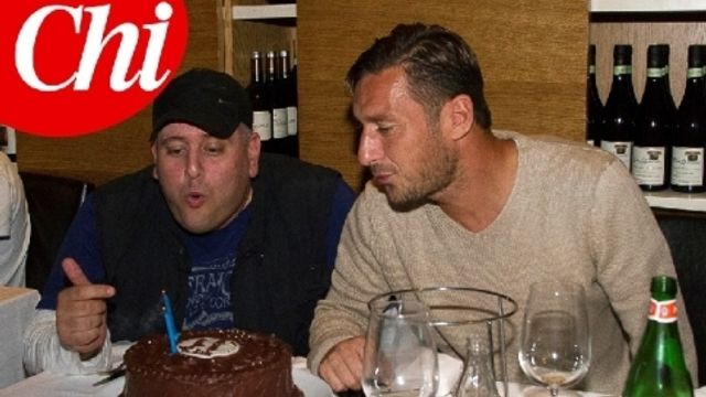 Un rilassato Francesco Totti fa festa al ristorante Assunta Madre di Roma. Il Pupone spegne le candeline sulla torta al cioccolato sulla quale campeggia la scritta "Auguri Francesco". Uno strappo alla regola meritato per il capitano giallorosso, che segue una dieta molto rigorosa per restare in forma e continuare a giocare ad alto livello.
