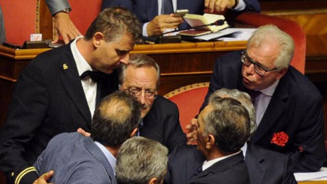 Sotto accusa il senatore di Ala Lucio Barani che fa gestacci osceni nell'Aula del Senato alla senatrice del M5S Barbara Lezzi e scoppia la bagarre in Aula. Secondo la descrizione che fa dell'accaduto il senatore Aldo di Biagio si sarebbe trattato del mimo di un rapporto di sesso orale. Molte senatrici hanno preso la parola contro Barani e il presidente Grasso ha sospeso la seduta per una decina di minuti.