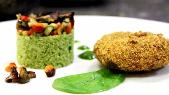 LA RICETTA: SCHIACCIATINE DI BROCCOLETTI, NOCI E UVETTA CON TORTINO DI QUINOA E CAPONATINA DI VERDURE (gentilmente offerta dal ristorante vegetariano Il Margutta - Roma) Emulsionare in un mixer 200 grammi di basilico e altrettanti di prezzemolo, con un filo di olio e acqua bollente, sale e pepe. Cuocere al vapore 200 grammi di broccoli romani e 120 grammi di broccoletti a foglia. Mettere altri 80 gr. di broccoli a fiore in una ciotola con 40 grammi di uva passa, 40 grammi di noci, sale e pepe, 400 grammi di pane grattugiato e impastare. Formare dei dischi di circa 6 cm di diametro e spessi 2 cm; panateli usando acqua e farina invece delle uova, per rispettare la natura vegana del piatto, quindi friggere in olio lasciando le schiacciatine dorate. A parte ammorbidite per 15 minuti in acqua 150 grammi di quinoa, quindi cuocete in acqua salata lasciando al dente e saltatela con fiori di broccoli, olio evo, sale e pepe. A parte ancora fate una dadolata di zucchine, melanzane, peperoni (servono 80 grammi per ogni ingrediente) e saltateli in padella con uno spicchio di aglio vestito poi insaporiteli con il basilico, l'uva passa e aggiustate di sale e pepe. Prendere un coppapasta di circa 6-7 cm e formare dei tortini con la quinoa e le verdurine saltate. Adagiarvi accanto le schiacciatine e decorare con l'emulsione alle erbe. LA RICETTA PASSO PER PASSO