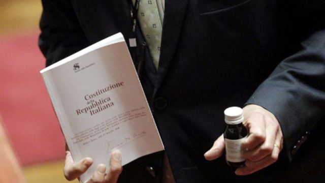 La Costituzione in mano e l'olio di ricino in bella mostra sul banco parlamentare. Così Roberto Calderoli ha fatto la sua dichiarazione di voto sulle riforme parlando in Aula, dove ha detto: "La Lega non parteciperà al voto e vi lascerà votare da soli questa roba. Temo che l'olio di ricino sia il nostro futuro". E ancora: "L'attentato alla democrazia nasce dal combinato disposto di legge elettorale e di questa riforma. Sì, perché approviamo la Costituzione voluta da Licio Gelli".