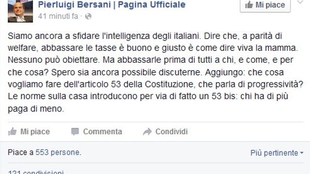 L'ex segretario del Pd Pier Luigi Bersani torna a criticare le scelte del governo in materia fiscale. E in un post su Facebook sostiene che "siamo ancora a sfidare l'intelligenza degli italiani. Dire che, a parità di welfare, abbassare le tasse è buono e giusto è come dire viva la mamma". Quindi, spiega che "le norme sulla casa della legge di Stabilità" snaturano la Costituzione stabilendo che "chi ha di più paga di meno".