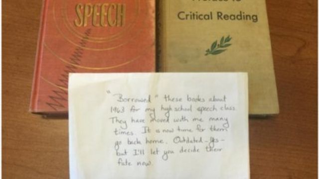 "Ho preso in prestito questi libri nel 1963 circa per un corso della mia high school. E sono rimati con me per molto tempo. Adesso è arrivata l'ora che ritornassero a casa. Molto vecchi, certo, ma lascio adesso a voi il compito di decidere il loro destino".
