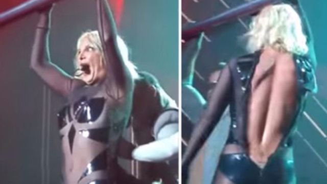 Britney Spears ci ricasca. La popstar è incappata in un nuovo incidente sul palco, stavolta molto più sexy della perdita di extension di qualche mese fa. Nel corso di uno dei suoi show a Las Vegas, la zip del body, stretto e trasparente, indossato dalla reginetta del pop ha ceduto, lasciando la cantante con la schiena completamente nuda. Nemmeno due ballerini, intervenuti per lunghi minuti, sono riusciti a metterci una pezza.