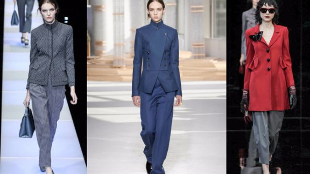 Look 1 - Da Giorgio Armani l'ensemble giacca/pantalone è un un must: nessuno come re Giorgio, infatti, ha fatto dell'eleganza morbida il suo marchio di fabbrica, come dimostrano bene le collezioni autunno-inverno 2015 di Giorgio Armani e Emporio Armani. Il blazer diventa lungo e si porta sui pantaloni palazzo (Zara) che lasciano intravedere il dettaglio che fa la differenza: uno stivaletto scamosciato tutt'altro che noioso (Remè Caovilla).