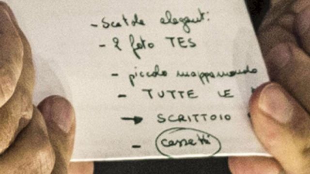 Un foglietto scritto a mano in inchiostro verde recante un elenco di oggetti: "cassetti, scatole eleganti, fototessere, scrittoio, un piccolo mappamondo". Si presenta così la "misteriosa" lista che Ignazio Marino ha piegato e messo in tasca durante il convengo per la presentazione del nuovo cda della fondazione Musica per Roma. L'ipotesi è che possa trattarsi di un elenco di cose che il sindaco avrebbe intenzione di portar via nel caso abbandonasse definitivamente il Campidoglio.