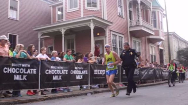 E' crollato a pochi metri dal traguardo, ma un poliziotto lo ha aiutato a percorrere l'ultimo tratto di strada che lo separava dall'arrivo e a concludere l'impresa. E' accaduta alla maratona "Rock'N'Roll" di Savannah, in Georgia, dove sabato il runner Robert McCoy è caduto all'improvviso in terra, non lontano dalla fine della corsa.