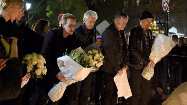 Dopo i sanguinosi attentati a Parigi, la band irlandese degli U2 ha deciso di annullare il concerto in programma sabato sera nella capitale francese. L'annuncio è stato dato dallo stesso gruppo sul proprio sito ufficiale. "Abbiamo assistito increduli e scioccati a quanto accaduto a Parigi - hanno scritto Bono e compagni - e i nostri cuori sono per le vittime e le loro famiglie". I quattro componenti della band si sono quindi recati davanti al Bataclan a deporre fiori in memoria delle vittime.