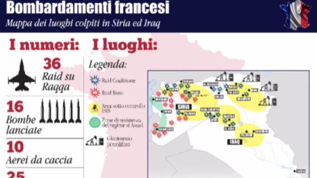 La risposta francese in seguito agli attentati del 13 novembre di Parigi non si è fatta attendere, e dopo i primi blitz di domenica sera, anche nella notte tra lunedì e martedì i jet di Parigi hanno colpito Raqqa, "capitale" dell'Isis: sono 36 i raid lanciati; 25 i luoghi colpiti tra Siria e Iraq . Le bombe sganciate sono almeno 16; 10 i cacciabombardieri adoperati. Ma è solo l'inizio, Hollande ha promesso che l'azione militare non si fermerà.