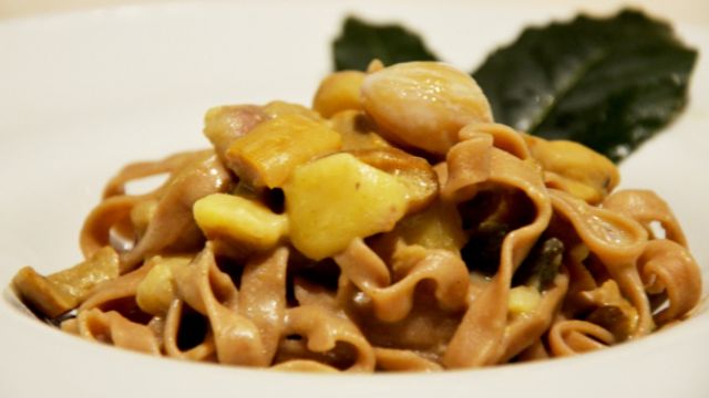 LA RICETTA: TAGLIATELLE DI BOSCO (gentilmente offerta dal ristorante vegetariano Il Margutta - Roma) - Preparare delle tagliatelle all'uovo con pari quantità di farina 00 e di farina di castagne; mettere a cuocere 200 grammi di castagne con 100 grammi di latte e alloro, a parte trifolare 320 grammi di funghi porcini tagliati a cubetti con un bouquet garnit, olio evo sale e pepe qb. Cuocere le tagliatelle, mantecarle con i funghi porcini e 200 grammi di castagne cotte nel latte. Aggiungere 80 g di parmigiano e decorare con alcune foglie di alloro e una castagna morbida, spezzata grossolanamente sopra il nido di pasta. LA RICETTA PASSO PASSO.