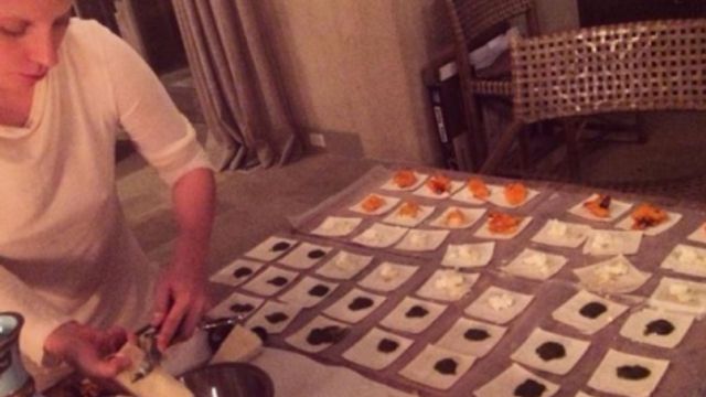 Sulla tavola di Lady Gaga spunta un po' d'Italia, anche se qualche ingrediente usato dalla cantante e attrice, di italiano pare avere solo il nome. Gaga si diverte a deliziare il fidanzato Taylor Kinney con pasta fresca fatta in casa, ripiena con un americanissimo burro di arachidi e pesto, che l'artista sottolinea essere fatto col basilico del suo orto. Il tutto condito con un ragù alla bolognese e un buon calice di vino rosso. "Proprio come la nonna", commenta la cantante accanto a una delle foto postate sul web, mentre a corredo di un altro scatto compare l'hashtag "#italiansdoitbest".
