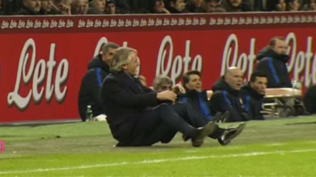 Scivolone a bordo campo per il tecnico dell'Inter Roberto Mancini che, durante il match col Frosinone, intercetta un pallone, lo calcia ma finisce rovinosamente a terra. Nessuna conseguenza per l'allenatore che si fa una risata e si rialza subito aiutato da un giocatore.