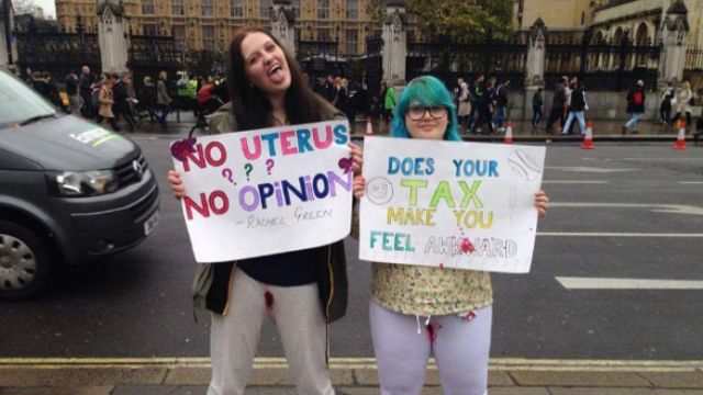 © twitter|Azione di protesta a Westminster: "Le tasse sono necessarie, lo capisco. Ma sono necessari anche gli assorbenti. Non sono beni di lusso".