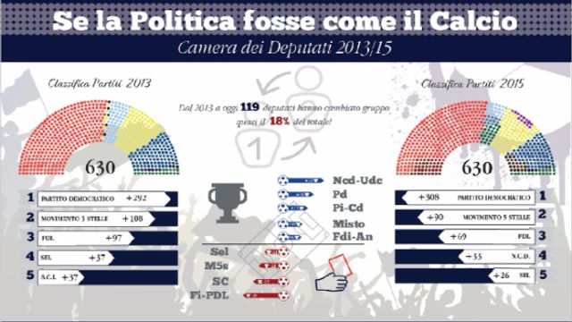 Marzo 2013 - Dicembre 2015, due anni e nove mesi di legislatura: e alla sua espirazione, mancano ancora due anni pieni, 2016 e 2017. Bene, con un tempo notevole ancora disponibile, i dati di quanto il Parlamento sia cambiato dal momento del suo insediamento. Nelle grafiche che potete osservare nella gallery, ecco i dati presentati davvero in forma "pallonara" della metamorfosi dovuta a scissioni, fuoriuscite, cambi più o meno coerenti di linea politica dei singoli. Ed ecco una "classifica" dei partiti non molto mutata nelle posizioni, ma sì, e tanto, nei punti: vince il Ncd di Angelino Alfano, costituitosi in uscita da Forza Italia, ha guadagnato seggi il Pd, sono planati - e non poco - il Movimento 5 Stelle, Forza Italia, Scelta Civica. La percentuale dei parlamentari che si è spostata nello schieramento, pari al 18% alla Camera dei Deputati, sfiora addirittura il 36% in Senato, il doppio, 116 che oggi, dentro una lista elettorale, sarebbero presenti da qualche altra parte.