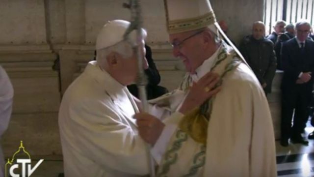L'88enne Papa Emerito Benedetto XVI ha assistito, nell'atrio della basilica di San Pietro, alla apertura della porta santa del Giubileo della misericordia. Papa Francesco lo ha abbracciato calorosamente appena entrato nell'atrio, e ha scambiato qualche parola con lui. Ratzinger ha poi varcato la Porta Santa pochi secondi dopo Bergoglio.