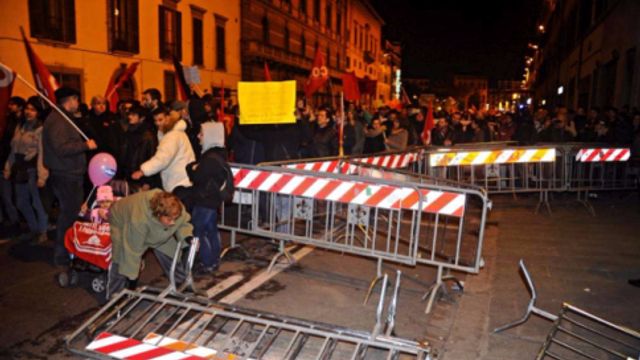 I manifestanti "No-Renzi" hanno superato il blocco delle transenne, riuscendo ad arrivare molto vicino al cordone delle forze dell'ordine, che impediscono loro di raggiungere la Leopolda. In assetto antisommossa, gli uomini della sicurezza stanno cercando di evitare che il corteo prosegua verso la zona dove si sta svolgendo la kermesse renziana.