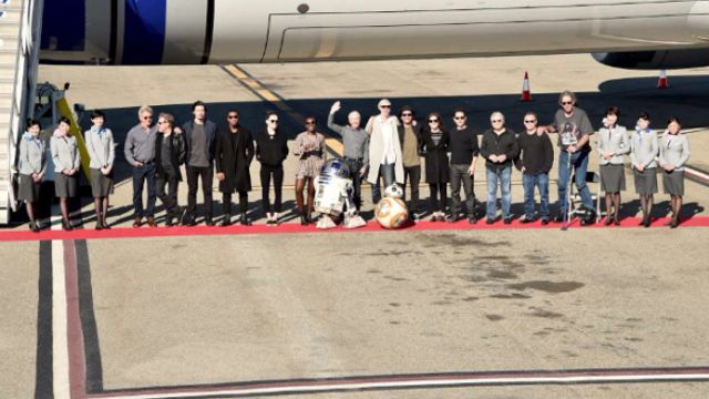 Per l'uscita ufficiale negli Stati Uniti dovranno aspettare il 18 dicembre, ma ci sono state le anteprime in tre cinema di Los Angeles. La stessa premiere, a cui erano attesi più di 4000 invitati, ha avuto luogo in tre differenti cinema, perché nessuna, neppure nella patria del cinema, Hollywood, poteva contenere tanta gente e tanto entusiasmo. Il cast al completo è arrivato a bordo di un aereo decorato come C-1P8. Una grande festa tra selfie con Harrison Ford, e Lupita Nyong'o, la conduttrice tv Maria Menounos e Sophia Vergara sul tappeto rosso con i capelli raccolti come la principessa Leila per rendere omaggio a Carrie Fisher. "Quella pettinatura non può essere realizzata senza eccessi di risate", ha commentato lei, sempre di buonumore, che vorrebbe vedere Nonna Leila con gli chignon grigi.