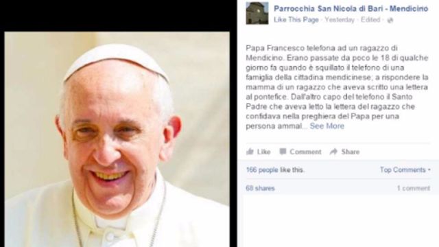 Preoccupato dalle condizioni di salute della zia, un bambino della parrocchia di San Nicola di Mendicino, in provincia di Cosenza, ha scritto a Papa Francesco chiedendo di pregare per la parente malata. Pochi giorni dopo il Pontefice lo ha chiamato. Al momento della telefonata il piccolo non era in casa e così a rispondere è stata la madre, che ha raccontato: "Ha voluto informarsi, quasi come se si trattasse di una persona di famiglia".