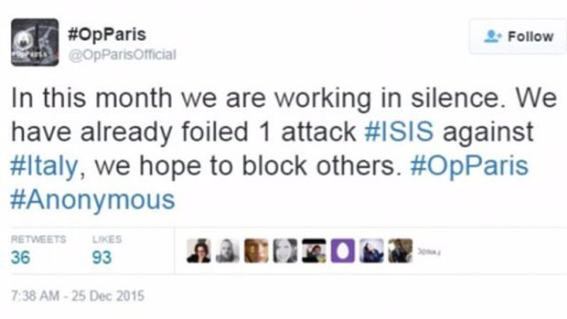Il collettivo Anonymous ha confermato sui propri canali ufficiali di aver effettivamente "sventato un attentato in Italia", e precisamente in un comune "specifico". Due jihadisti sarebbero stati "intercettati" da un attivista francese mentre parlavano della pianificazione dell'attacco.
