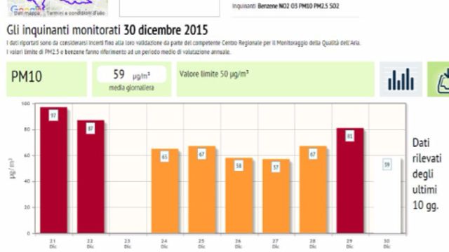 Milano, dati in miglioramento - Secondo il bollettino di Arpa Lombardia a Milano, mercoledì la centralina di Milano-Pascal segnalava 59 microgrammi per metro cubo d'aria contro gli 81 del giorno precedente, quella di Milano-Senato 51 contro 83, e quella di Milano-Verziere 45 da 73 del 29 dicembre.